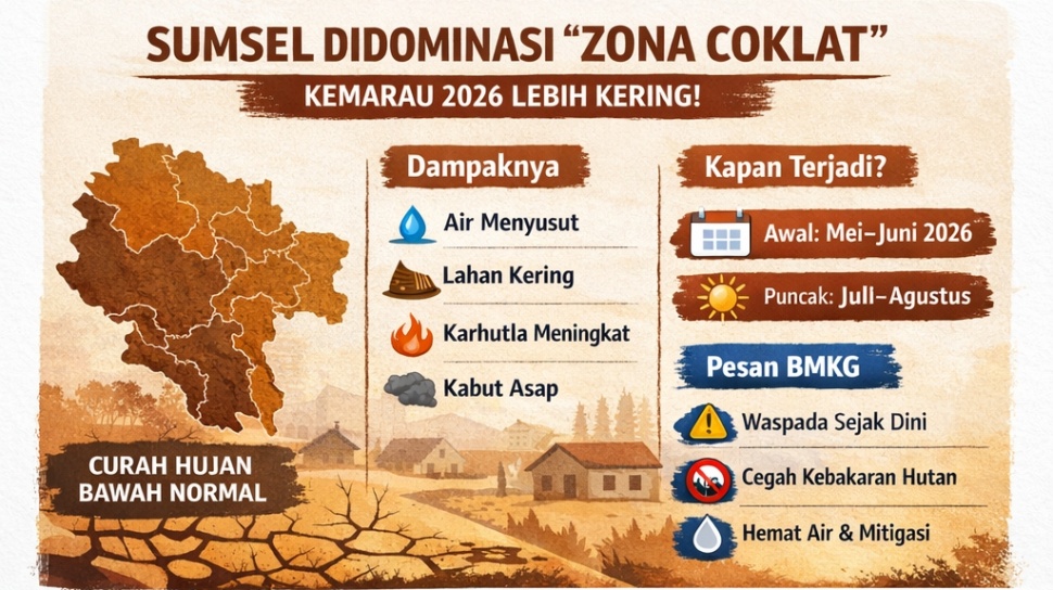 Dengan suhu yang sudah terasa panas sejak Maret dan peta yang menunjukkan dominasi zona coklat, kemarau 2026 di Sumatera Selatan tampaknya bukan sekadar datang lebih cepat, tetapi juga membawa tantangan yang lebih besar.